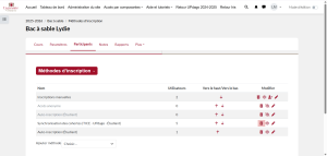 Il faut savoir que pour les inscriptions par cohorte synchronisée ou par lien méta-cours, il n’est pas possible de supprimer les participants individuellement. En effet, en utilisant ces deux méthodes, les inscriptions sont synchronisées et se font automatiquement. Vous pouvez toutefois supprimer la cohorte entière ou bien toutes les personnes inscrites par lien méta-cours depuis l’interface « Méthodes d’inscription ».